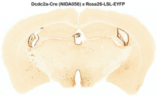Hetero/Hemizygous: If a Dcdc2a-Cre (NIDA056) mouse is crossed with a mouse possessing a floxed allele, recombination is expected to occur in ependymal cells lining the ventricle of the brain and in choroid plexus. Recombination is also seen in tanycytes in the third ventricle and a few scattered neurons and astrocytes.